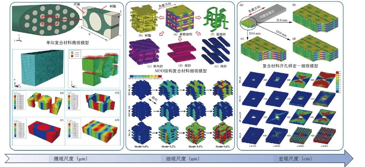 三维纺织复合材料的损伤演化往往会跨越多个尺度。初始损伤发生在纤维束内的微观尺度,表现为纤维/基体界面脱粘、束内基体开裂和纤维断裂。随后,损伤扩展至单胞结构的细观尺度,涉及纱线间基体分层和纱线断裂,损伤累积导致宏观结构失效。因此,采用多尺度分析方法来关联微观、细观和宏观尺度上的几何特征、应力/应变场状态和损伤信息至关重要。常见的多尺度分析方法包括顺序多尺度分析、并发多尺度分析和数据驱动的多尺度分析。多尺度分析步骤主要包括:首先通过实验标定微观组分(碳纤维、树脂、界面)的力学性能;随后在微观尺度上建立一个包含随机分布碳纤维、环氧树脂基体及界面的单向纱束模型,用于预测纤维束的整体力学性能;进而在细观尺度,基于三维编织几何拓扑建立包含纤维束(赋予由微观均匀化所得等效属性)和树脂基体的单胞模型,据此进行基于微观均匀化属性的细观尺度数值模拟;在宏观尺度,则基于细观尺度均匀化获得的等效性能,模拟复合材料试样的拉伸、弯曲等性能;最终,将细观模型和宏观均质模型的数值模拟结果与实验结果进行对比验证。