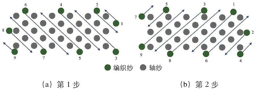 三维编织技术是通过织机驱动绕有纱线的携纱器,牵引纱线循环交织从而制成具有空间三维网状结构的织物。三维编织预制体中,编织纤维(或纱线)沿织物成型方向以一定角度取向,编织物厚度超过参加编织纱线或纤维束直径 3 倍以上,且在厚度方向上纱线相互交织。典型的三维编织工艺包括行列式编织和旋转式编织两大类。