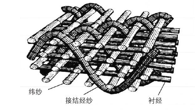 三维机织技术是利用多层经纱织造方法,通过接结经纱穿插纬纱层形成整体预制体。典型的三维机织预制体包含接结经纱系统和纬纱系统两个纱线系统,其中接结经纱通过弯曲穿插多层纬纱将其绑定,形成整体不分层结构。根据纱线交织规律,三维机织结构可分为多层接结组织、角联锁组织和正交组织 3 种。其中,正交三维机织预制体由 0°、90°和90°(Z向)3个相互垂直的纤维束组成,形成立体的正交网格结构;角联锁三维机织结构(图 4)则是各层织物通过倾斜纱线互相联结,使织物层间产生角度交织。