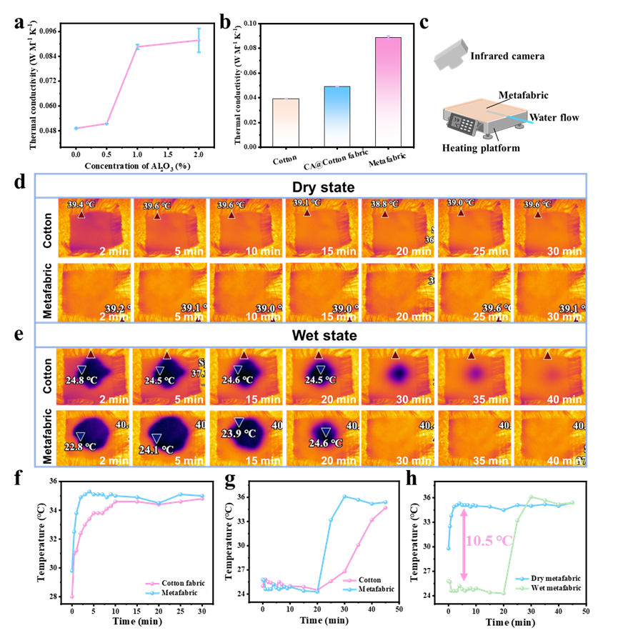 图1显示,超织物在水分管理与冷却性能方面表现优异。经单面等离子体处理后,织物沿厚度方向形成润湿梯度,实现汗液定向传输。静电纺纳米纤维中引入Al2O3后,棉织物的导热性能提升,提高了汗液冷却的速度。其蒸发速率高达0.41 g/h,居现有服用棉织物前列,这是由于毛细效应扩大的蒸发面积增加与提升的传热效率共同作用的结果。凭借这一综合优势,该超织物为个人热湿舒适功能纺织品提供了重要参考。
