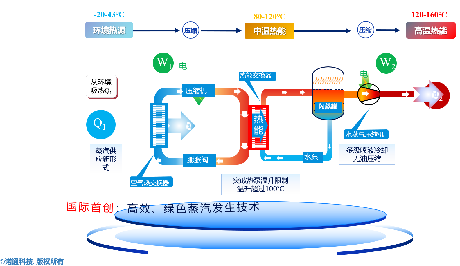高温热泵蒸汽发生技术:通过以螺杆压缩机为核心的逆卡诺循环,实现普通压缩机难以达到的高温输出。高温螺杆热泵通过消耗少量电能,驱动高温工质在蒸发器、压缩机、冷凝器和节流装置中循环,从低温热源中吸热,并将其提升至高温后释放给工艺用热系统。整个系统消耗的电能远小于它从低温热源吸取并输送到高温端的热能,性能系数(COP)较高。主要工艺参数如下: