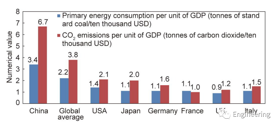 图1. 2020年主要国家单位GDP能耗和二氧化碳排放量。