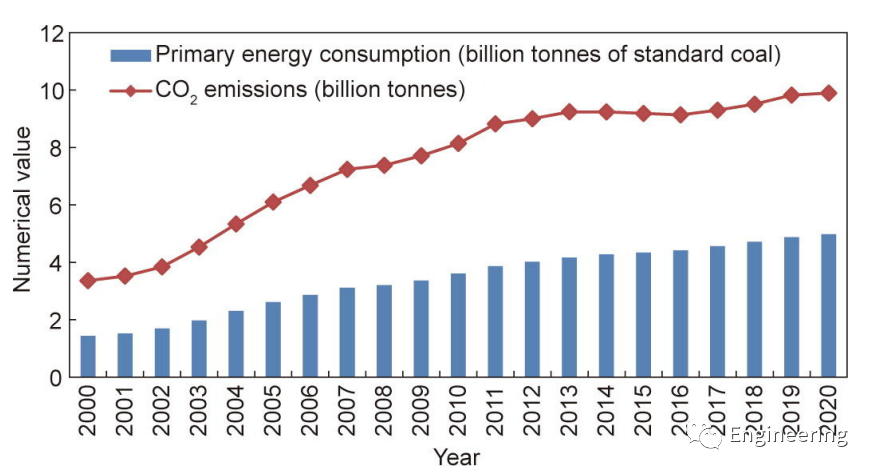图2. 我国能源消费和二氧化碳排放量变化趋势。