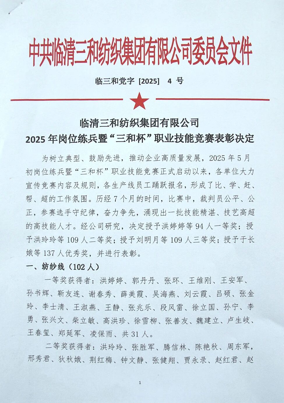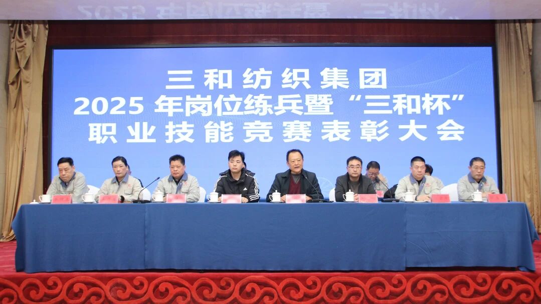 12月16日下午,三和纺织集团在宾舍召开2025年岗位练兵暨“三和杯”职业技能竞赛表彰大会,总结竞赛经验,表彰先进典型,激励广大职工立足岗位、持续提升技能、锻造高素质产业工人队伍。集团公司党委领导、生产线各位副总经理、各生产厂厂长、各部室部长、工委会主任以及部分获奖职工共计150余人参加会议。临清市总工会党组成员、副主席初志伟,临清市职业技能指导服务中心科长秦政应邀出席会议并讲话。