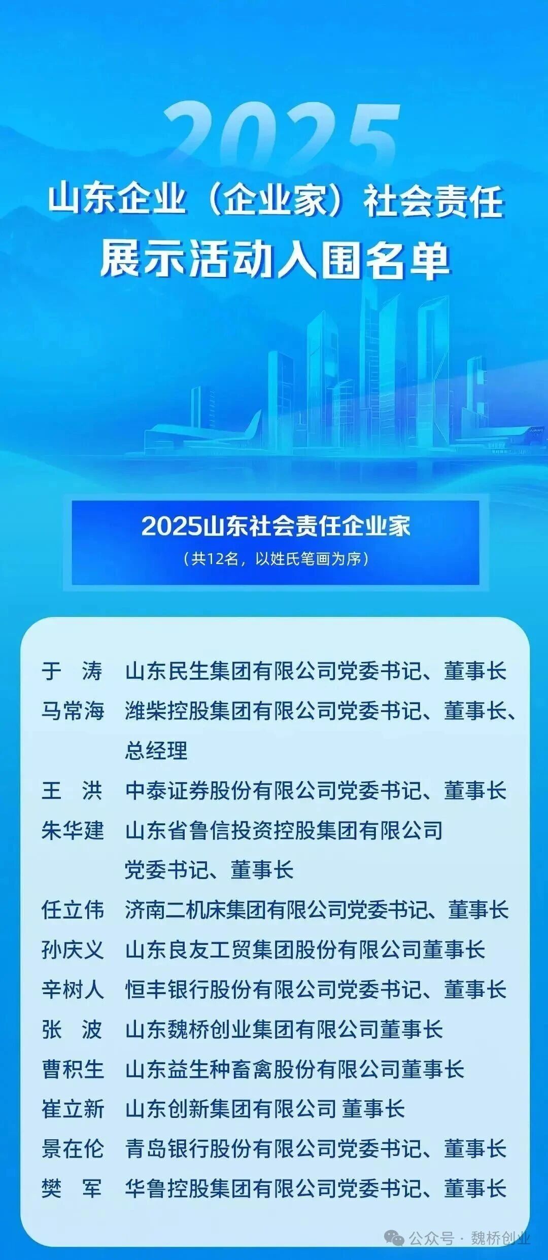 近日,由大众报业集团(大众日报社)、中共山东省委金融委员会办公室、山东省工商业联合会、山东省人民政府国有资产监督管理委员会、山东省市场监督管理局、山东省社会工作联合会共同主办的“2025山东企业(企业家)社会责任”展示活动名单揭晓。魏桥创业集团董事长张波荣获“2025山东社会责任企业家”殊荣。