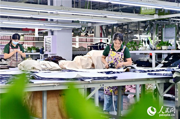 9月17日,工人在赢家时装(赣州)有限公司生产车间加工女装订单产品。人民网 朱海鹏摄