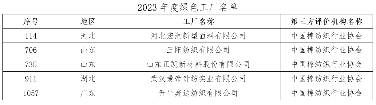 2024年1月5日,工业和信息化部公布了2023年度绿色制造名单,包括绿色工厂1488家、绿色工业园区104家、绿色供应链管理企业205家。其中,由中国棉纺织行业协会(以下简称“中棉行协”)评价的5家纺织企业全部成功创建为“国家绿色工厂”。