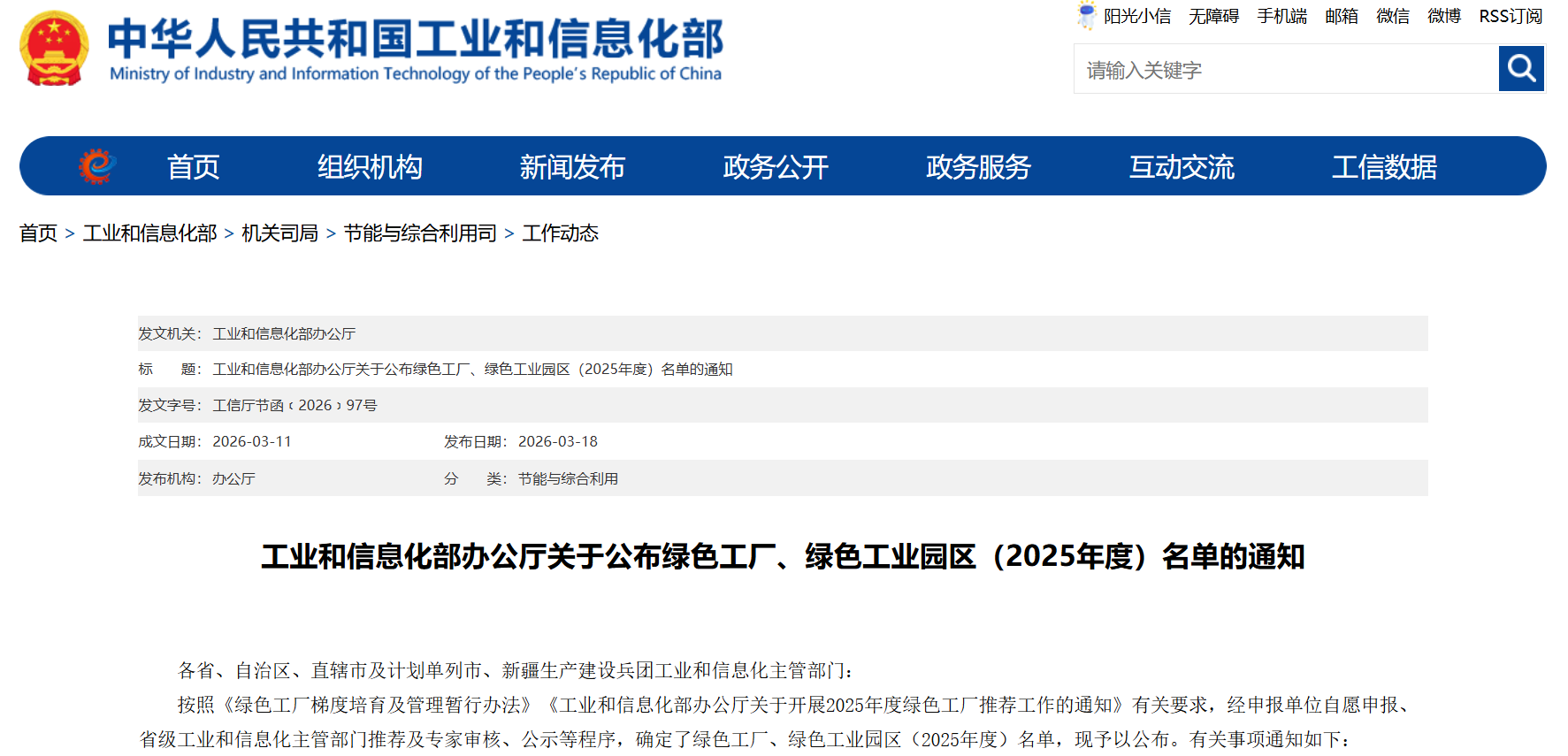 查看详情请登录工信部网站:工业和信息化部办公厅关于公布绿色工厂、绿色工业园区(2025年度)名单的通知