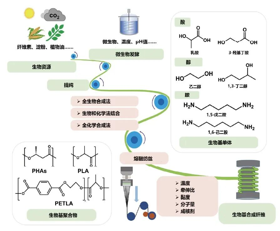 生物基合成纤维是以生物质资源为原料,经化学转化或生物转化获得聚合单体,再通过加聚反应或缩聚反应合成线型高分子化合物,并经纺丝工艺制得的一类纤维材料(图 1)。与传统石油基化学纤维相比,生物基合成纤维在原料可再生性、环境友好性以及碳减排潜力等方面具有明显优势,同时部分产品在力学性能、加工适应性和服用性能方面也能够满足实际应用需求,某些品类还兼具一定的生物可降解潜力。当前所称的“生物基聚合物”或“生物基合成纤维”,其技术核心并不在于聚合或纺丝工艺的颠覆,而在于以生物基单体替代化石来源单体。在多数情况下,聚合反应路线及纺丝技术仍沿用现有成熟工艺体系,例如已实现工业化生产的聚对苯二甲酸乙二醇酯(PET)、聚酰胺(PA)和聚乳酸(PLA)等,现有聚合装备和纺丝设备在生物基合成纤维生产中具有较强的适用性。