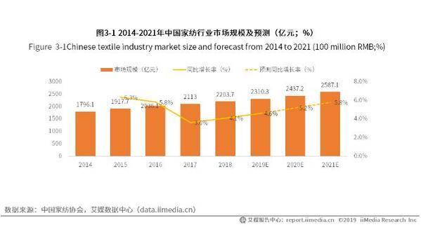 当前,中国家纺行业总体规模扩大,将保持平稳增长。iiMedia Research(艾媒咨询)数据显示,2018年中国家纺行业达到2203.7亿元,同比增长率4.1%,预计2021年将达到2587.1亿元,同比增长率5.8%。
