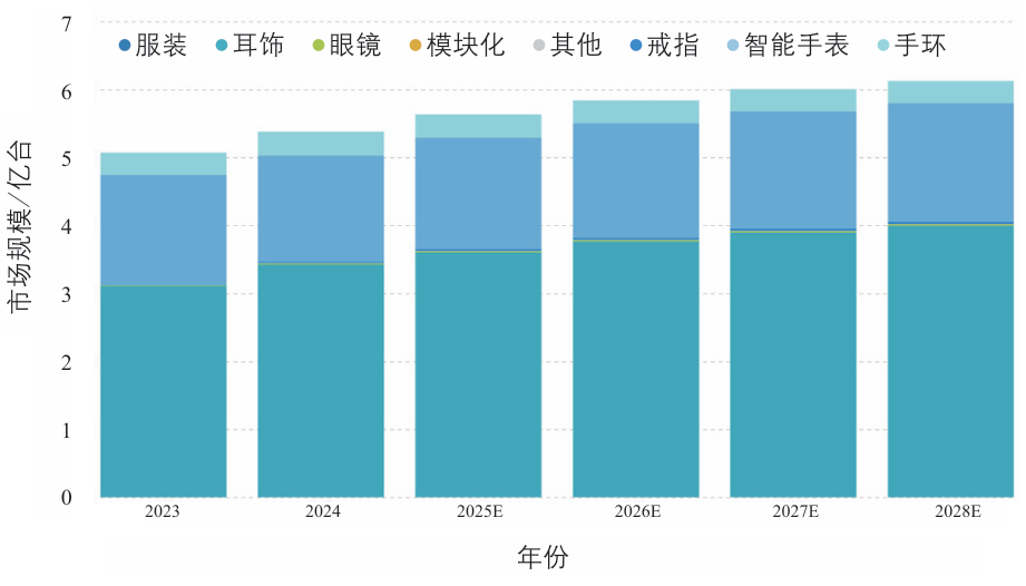 IDC发布的Worldwide Quarterly Wearable Device Tracker报告显示(图 1),2024年底全球可穿戴设备出货量有望增长6.1%,达到5.38亿台。预计到2028年,全球可穿戴设备出货量将增至6.457亿台。智能可穿戴纺织品在其中的占比呈现稳步提升趋势。
