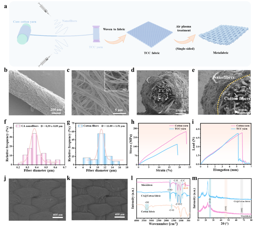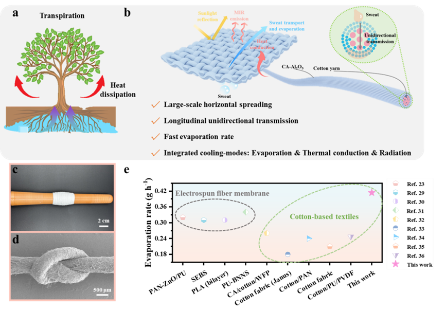 近期,东华大学覃小红教授团队在Advanced Fiber Materials上发表了题为“Core-shell yarn woven metafabric: Integrated autonomous sweat transport and radiative-perspirative cooling”的研究成果。该研究受植物蒸腾作用启发,采用醋酸纤维素(CA)@氧化铝(Al2O3)静电纺纳米纤维与棉纤维复合,制备出智能芯鞘纱(SCSY),并进一步织造成织物。通过单面等离子体处理,开发出一种具备单向汗液传输和冷却性能的超织物。该芯鞘纱线基超织物实现了汗液的定向传输,并通过蒸发、热传导及热辐射三种机制的协同作用,实现自主降温,为提升个人热湿管理纺织品的蒸发速率和冷却效率提供了新思路。