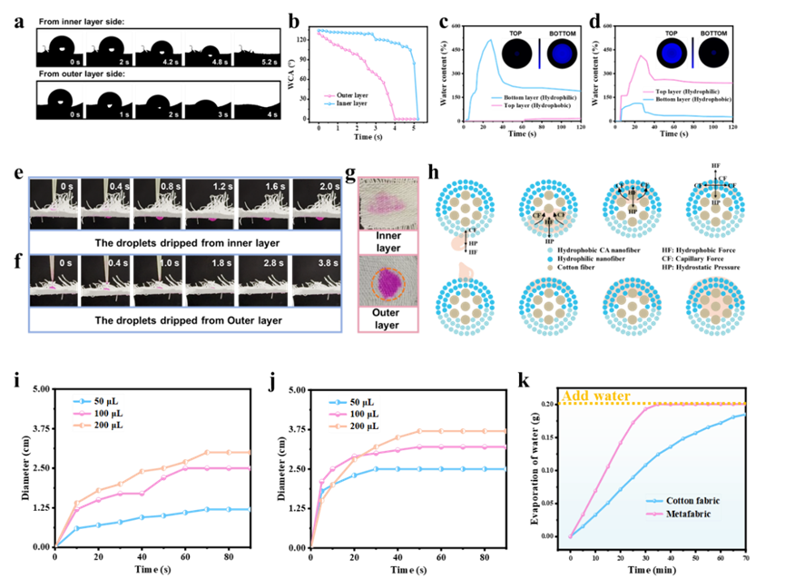 图3a-b的光学图像和水接触角(WCA)显示,超织物内层疏水、外层亲水,这是超织物具有优秀的单向水传输性能的重要原因之一。图3h进一步演示:液滴先在内层润湿,随后沿厚度方向传输并克服重力;当液滴抵达棉纱与外层亲水纳米纤维的界面时,因纤维直径骤减产生的毛细力(CF)将其迅速拉出芯层并在外表面铺展成膜。图3i-k的蒸发测试表明,超织物的蒸发速率高达0.41 g/h,远超普通棉织物。