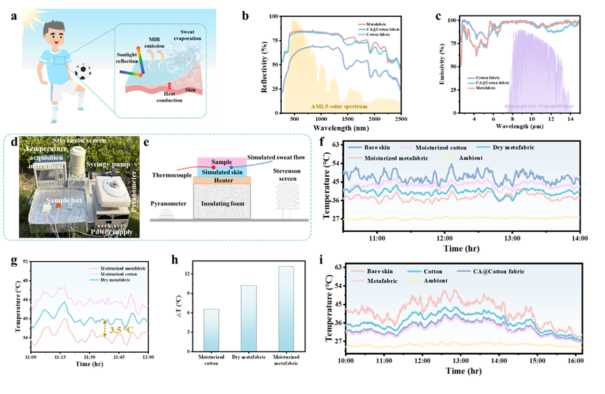 图5的户外实验进一步评估超织物在实际出汗场景下的降温效果。模拟人体出汗时,覆盖湿润超织物的皮肤温度比裸露皮肤低13.2 ℃;与干态相比,湿态超织物额外降温3.5 ℃。凭借单向导湿与快速蒸发,超织物覆盖区域的温度比棉织物低约7 ℃,显著缓解户外热应激。
