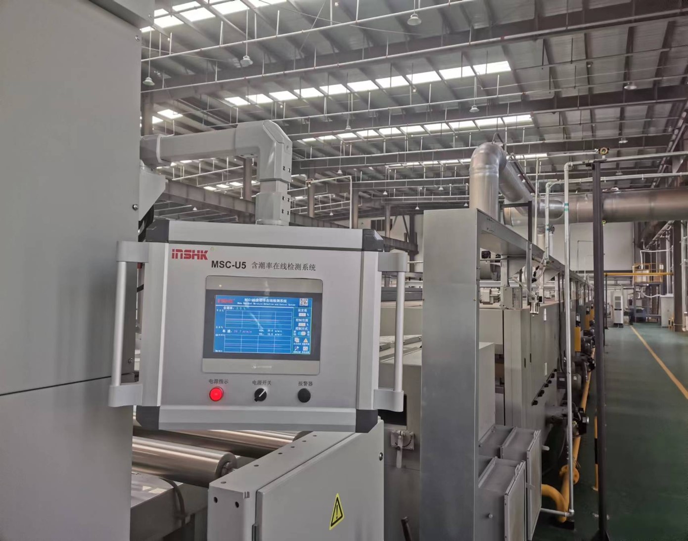 MSC-U5织物含潮率在线检测系统:基于传感器技术和电子技术研究了无接触式织物含潮率在线精准测量系统,创新设计了电容式含潮率在线检测装置,利用织物含潮率变化引起电容值变化的原理,织物作为电介质并与电极板形成电容传感器,测量精度达到±0.5%,控制精度达到±0.8%,实现了织物含潮率在线精准测量。系统由inshk全幅湿度传感器、专用线缆、控制单元及人机界面组成。inshk全幅湿度传感器将湿度检测信号通过专用线缆传输至控制单元,经计算机高速数据处理后,在10.1寸人机界面上实时显示。用户可通过人机界面设定织物目标含潮率,系统根据设定值与检测值对比,采用先进的模糊PID算法,自动输出控制信号,调节蒸汽阀门开度,控制烘筒蒸汽流量,从而实现织物含潮率的精准控制。