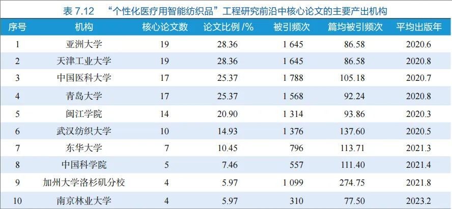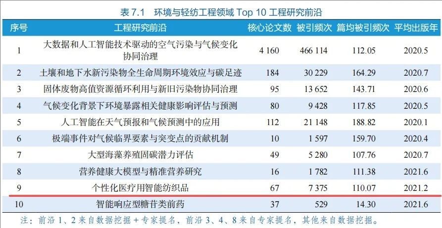 在本次发布的报告中,个性化医疗用智能纺织品入选环境与轻纺工程领域Top10工程研究前沿,并被作为该领域的Top3前沿进行重点解读,成为纺织科技跨界融合的标志性成果。