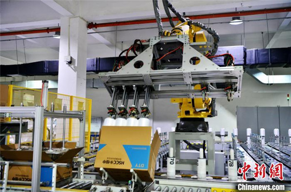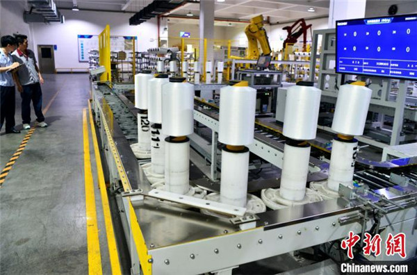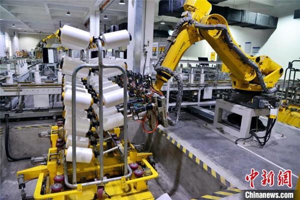 5月31日,福州市长乐区一家化纤纺织企业智能车间内,机器人在生产线上作业。 张斌 摄