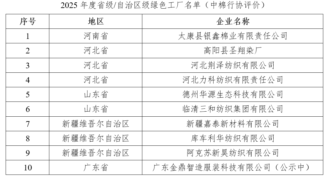 为全面加强绿色制造体系建设,强化绿色制造单位梯度培育,今年以来,全国各地区工信部门组织开展了2025年度省级/自治区级绿色制造单位推荐工作,并于近期陆续发布了绿色制造单位名单。其中,中国棉纺织行业协会(以下简称“中棉行协”)受托评价的10家企业成功创建为省级/自治区级绿色工厂。