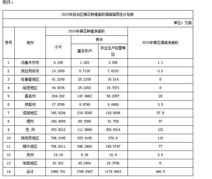 附件:2015年自治区棉花种植面积调减指导性计划表