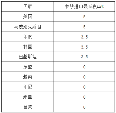 印度作为“一带一路”上的重要大国、全球最大的棉花生产国、全球最大的棉纱出口国之一,减免关税政策的出台势必对该国棉花产业产生重大影响。据印度业内人士透露,印度总理访华期间中国领导人表示将促进中印之间的棉纱贸易,并承诺将下调印度棉纱进口关税。据某位业内人士称,关税的减免及棉纱进口无配额限制,这两大优势或将促进中国印巴纱进口量的再次突破,将会促进国内棉花与纺企的快速转型。印度承诺将下调印度棉纱进口关税。下图是中国从各国家、地区进口棉纱的最低税率。