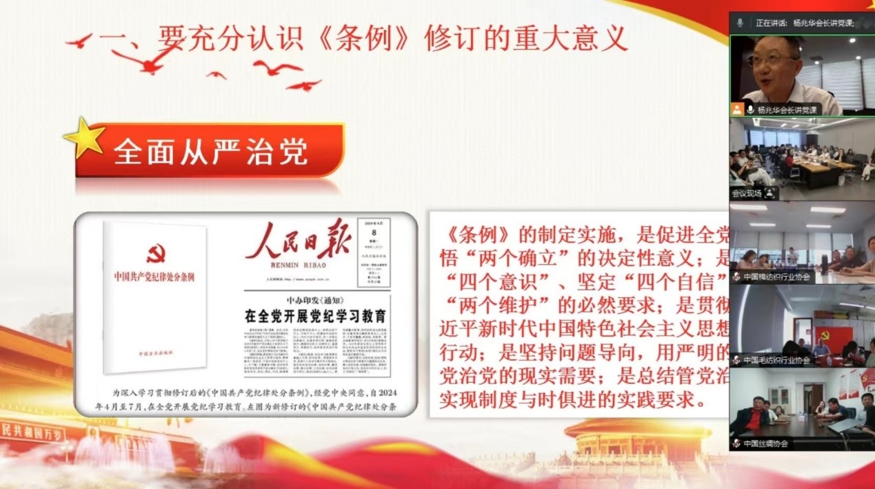 首先,中国纺联党委委员、副会长杨兆华以《深入学习(纪律处分条例) 切实推动落实落地》为题讲专题党课。中国棉纺织行业协会、中国毛纺织行业协会、中国麻纺织行业协会、中国丝绸协会、中国家用纺织品行业协会、中国纺织工业联合会品牌工作办公室等单位通过线上或线下的方式聆听了专题党课。
